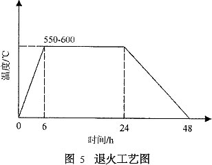 殘余應(yīng)力會引起鋼件在使用一定時間以后,或在隨后的切削加工中產(chǎn)生變形或裂紋。耳軸退火主要用來消除堆焊造成的殘余應(yīng)力、細(xì)化金相組織。采用局部退火裝置:制作一鋼筒,鋼筒內(nèi)、外襯石棉,內(nèi)盤電熱絲;鋼筒一端開口,套在耳軸上開口部與包體焊接固定;退火時鋼筒四周覆石棉,鋼包內(nèi)耳軸位置覆石棉;對每只鐵水罐退火過程嚴(yán)格按照圖5所示溫度曲線要求。