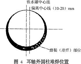 對煉鐵廠100 t鐵水罐的耳軸磨損進(jìn)行了分析,通過耳軸彎曲強(qiáng)度核算,確認(rèn)需修復(fù)磨損量。通過對焊縫強(qiáng)度校核,證明更換耳軸的方案不可行,從而選用耳軸表面堆焊的處理工。焊后采用退火處理,以消除焊接殘余應(yīng)力,效果良好。